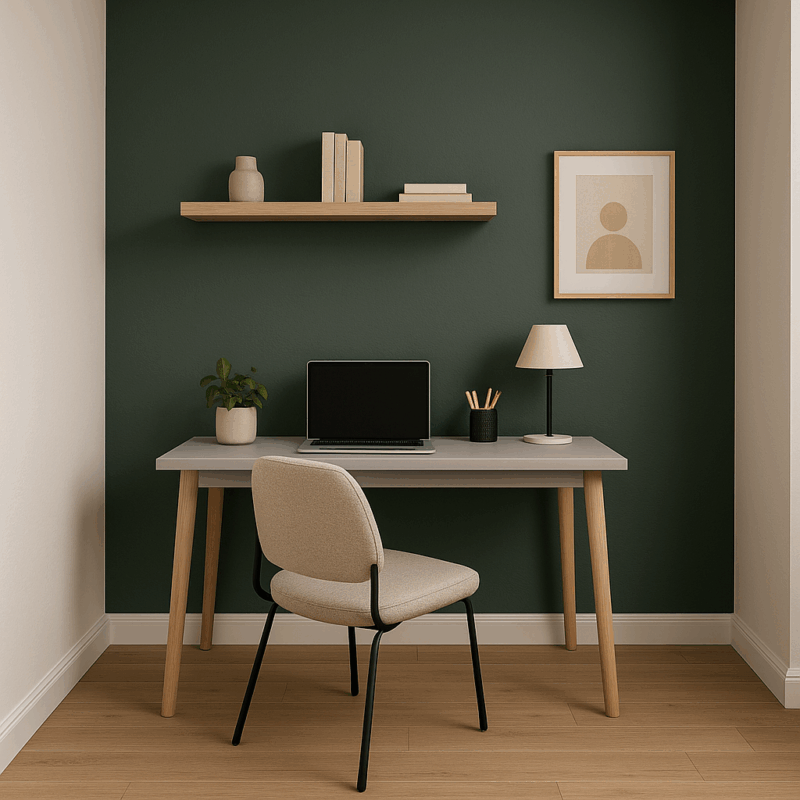 Add an accent wall behind your desk to energize your workspace and improve focus. Many homeowners find this one of the most functional interior accent wall ideas, especially during darker months.